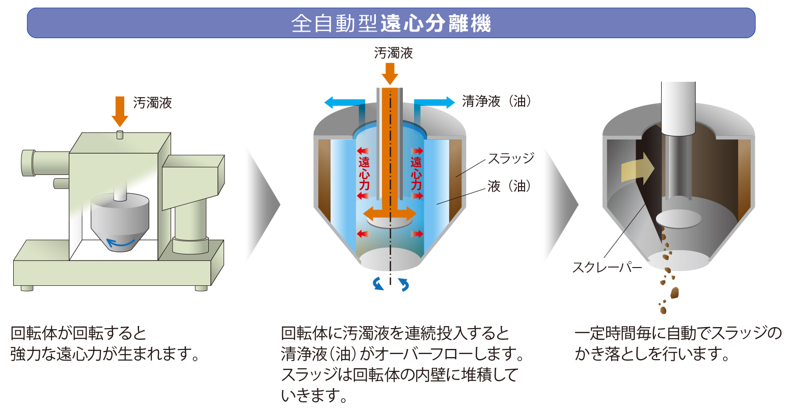 遠心式:遠心力と比重差を利用し廃液から夾雑物や油を回収。