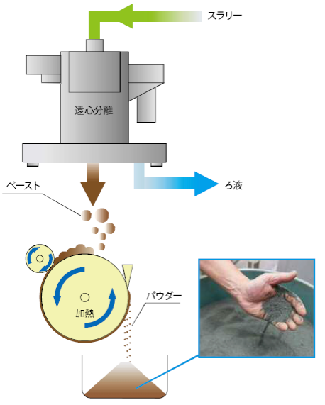 - 全自動運転でスラリーを含水率20~35%以下のパウダー(粉末)状にします